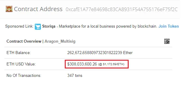 • Etherscan ICO Aragon address, currently contains 262 672 ETH.