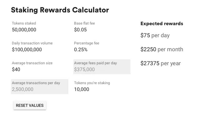 Omise creates a calculator, where you can calculate a theoretical profit from deposited OMG into Proof of Stake protocol. The calculations are applied to the theoretical situations when the network processes volume 100M USD per day.